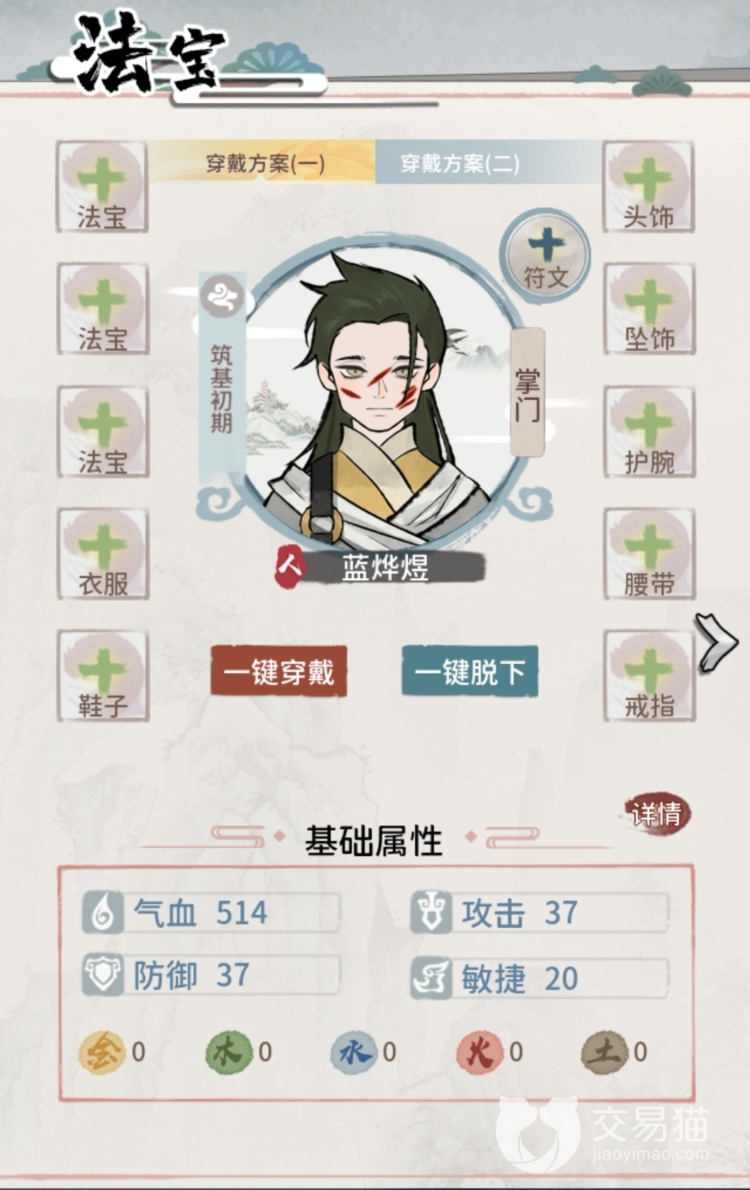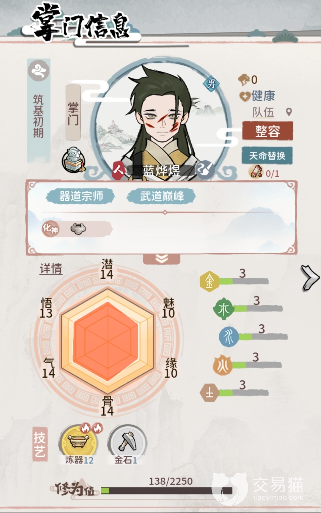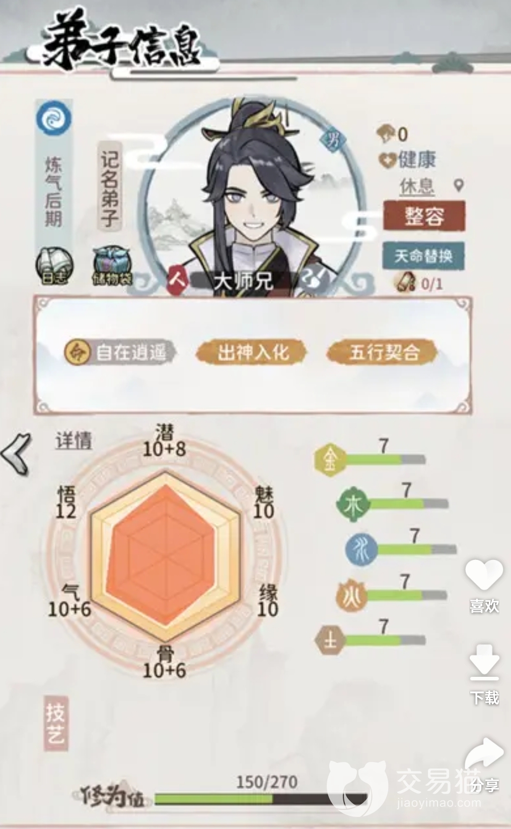 大师兄并不是开局就能获得的角色,需要玩家完成试炼活动后才能解锁,不同于其他弟子,大师兄在先天六维资质不低的情况下还有12种专属的属性天赋可以选择其二,出神入化、五行契合、天赐灵缘、炉火纯青、铸器淬金、奇门遁法、闲云野鹤、财运亨通、灵木收集、天衣无缝、巧夺天工、玉树临风,赋予大师兄特定的天赋后,会有相关属性的额外加成。