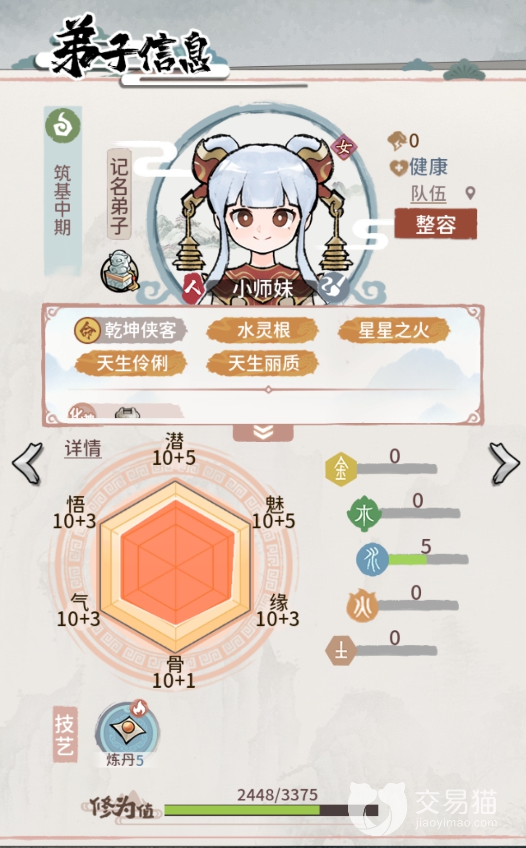 小师妹的先天六维资质丝毫不逊色于掌门人,五行灵根不会呈均衡趋势发展,但会有一个到两个属性特别突出,可以选择将这个属性加点到最高,就比如小编培养的小师妹修为值达到2200水属性都已经达到5点,而同时期的掌门人水属性才到3点。总体来说小师妹属于先天资质优秀的天才型弟子,其战力值有时候可以远超其他弟子甚至是掌门人,是5人小队中的核心之一。