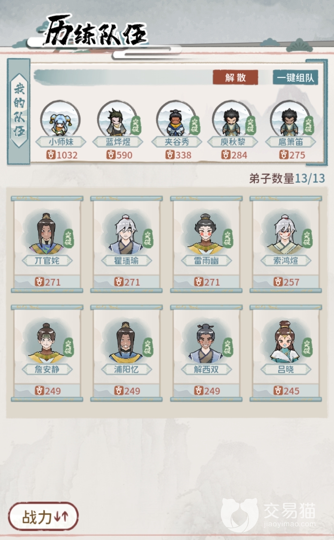 野外刷图的话通常对战都需要五人队伍,小编推荐队伍核心掌门人+小师妹,如果没有想着力培养的徒弟,其他三个人可以任选,升级经验也主要用在掌门人和小师妹,其他工具人做好木工、制衣、炼丹等一些杂活就好了,不需要花费过多升级经验。