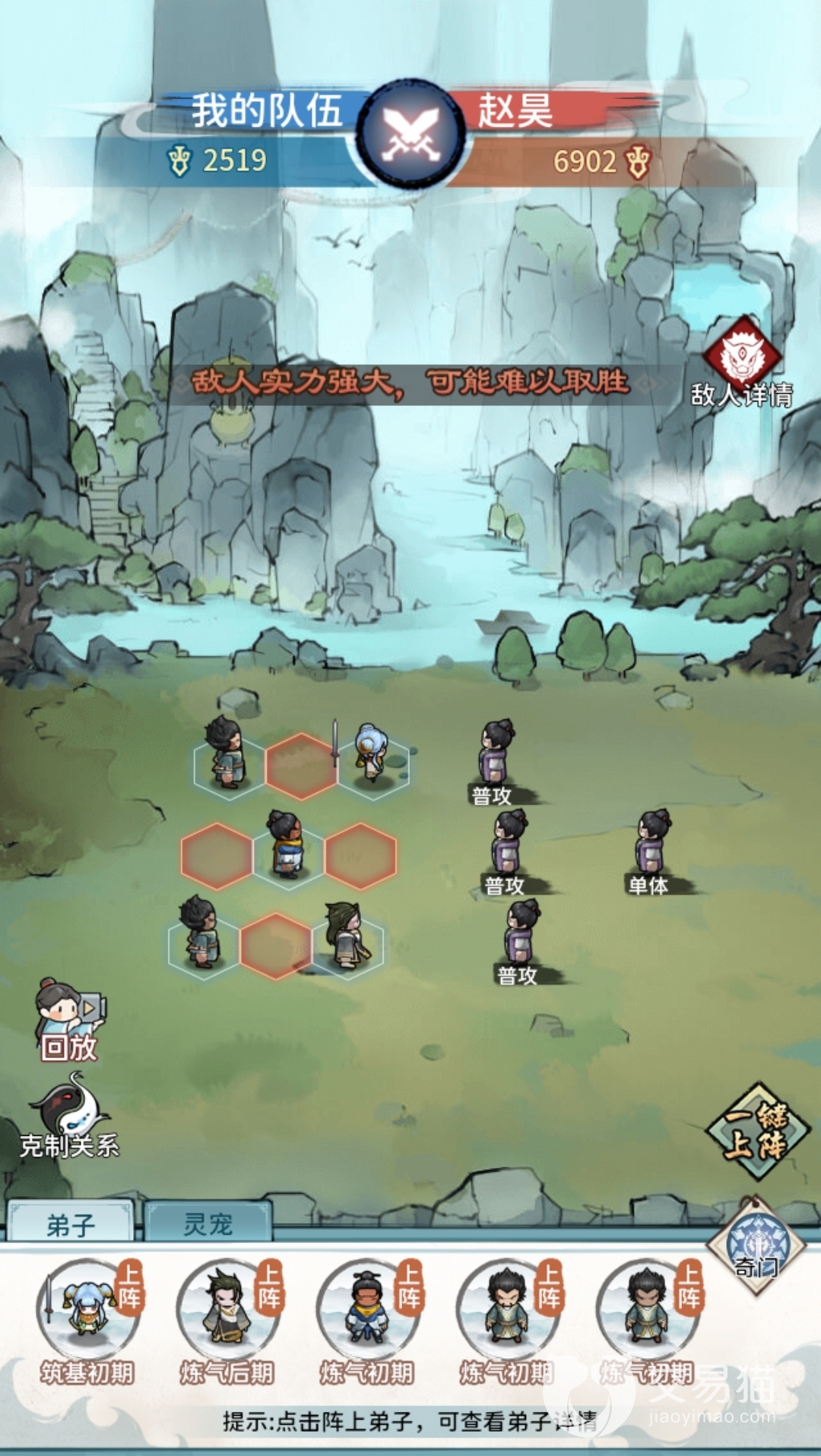 战斗最好选择奇门阵型,一方面阵型组合对徒弟等级要求低,另一方面可以加快战斗速度,节省时间。一般前期小师妹是团队的输出核心,所以装备优先给小师妹佩戴。战斗都是采用回合制玩法,所以如果小师妹的等级和装备可以碾压对手,基本上两回合解决战斗。