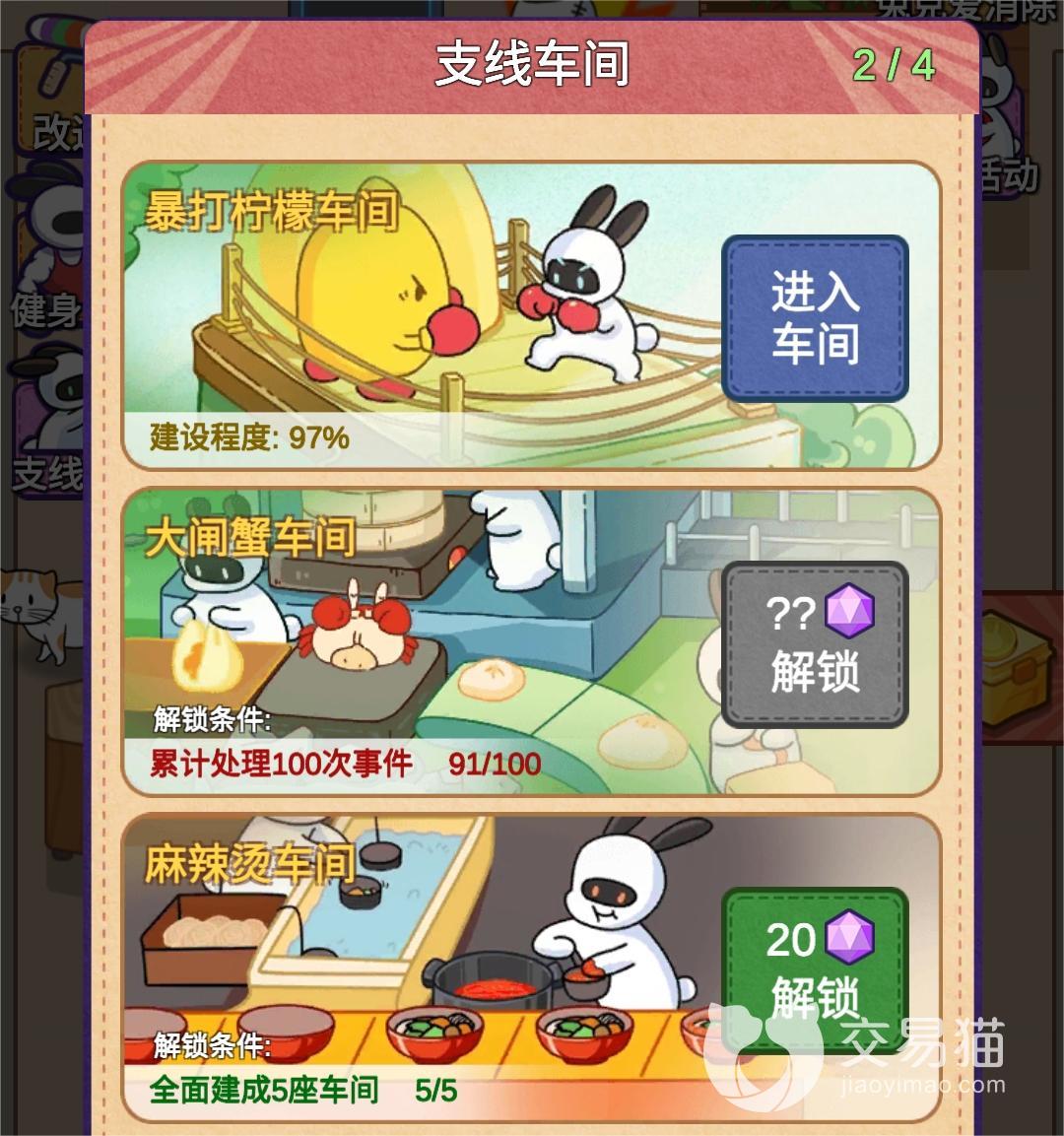 在解锁主线任务的同时,还会有支线车间不断开放。比如暴打柠檬车间,大闸蟹车间,麻辣烫车间等等。这几个车间也非常有趣,而且能够带来额外的收益。