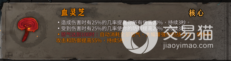 最后再看看血灵芝,攻击时加伤害,被攻击时加防御,虽然是概率触发,但也十分全面了。并且在满怒时还会消耗怒气进一步增加这两种属性。