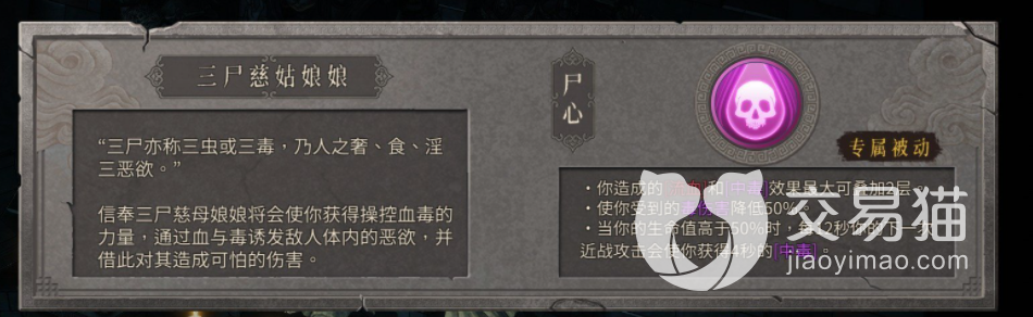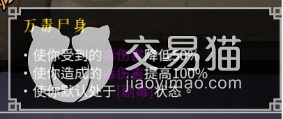 可以增加毒伤害的秘籍万毒尸身和道具尸变断指是最最关键的选择,这两个可以把毒伤的持续能力和伤害能力大大提高,操作门槛也会变低,因为全程自身都带毒了,不用再用高血量时的近战攻击去触发自身中毒,有更高的暴毙风险。搭配毒刃的流血,以及判官时刻的爆发伤害,玩家就会变成一个站桩会扑街,动起来就是毒气弹的强力输出角色。
