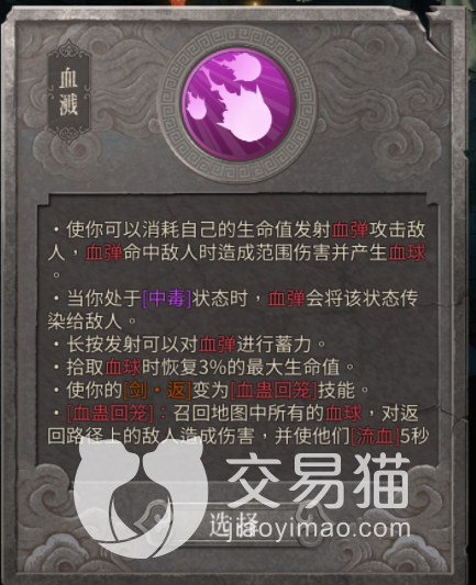 血毒流具体指血溅这个操作流派,即把右键的飞剑转变为耗当前百分比血发射的血弹,血弹的伤害是AOE,打中敌人就可以产生能回复血量的血球。玩家自己如果已经中毒了,打出去的血球就会让敌人中毒,同时还能传染,加上血球捡起来可以按最大百分比回血,所以血毒流是个时刻都在掉血,时刻都在回血的“作死”流派。有一定紧张感,但也很爽快。