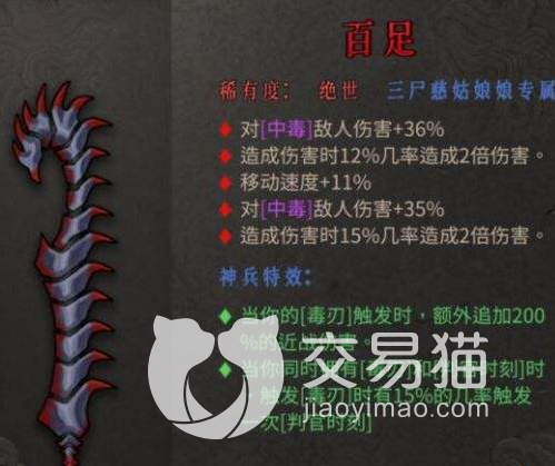 武器上选择自然是增伤越高越好,太祖是头号种子,百足,青蛇等武器依次排开。因为血毒流的操作要点就是要跑得快,打得快,灵活的生存才能保证给敌人叠上更高的血和毒,不需要过多的与敌人进行近距离接触或者找位置,套上buff后就有了走位的等待时间。所以是个门槛很低,操作上下限都相对过得去的流派。