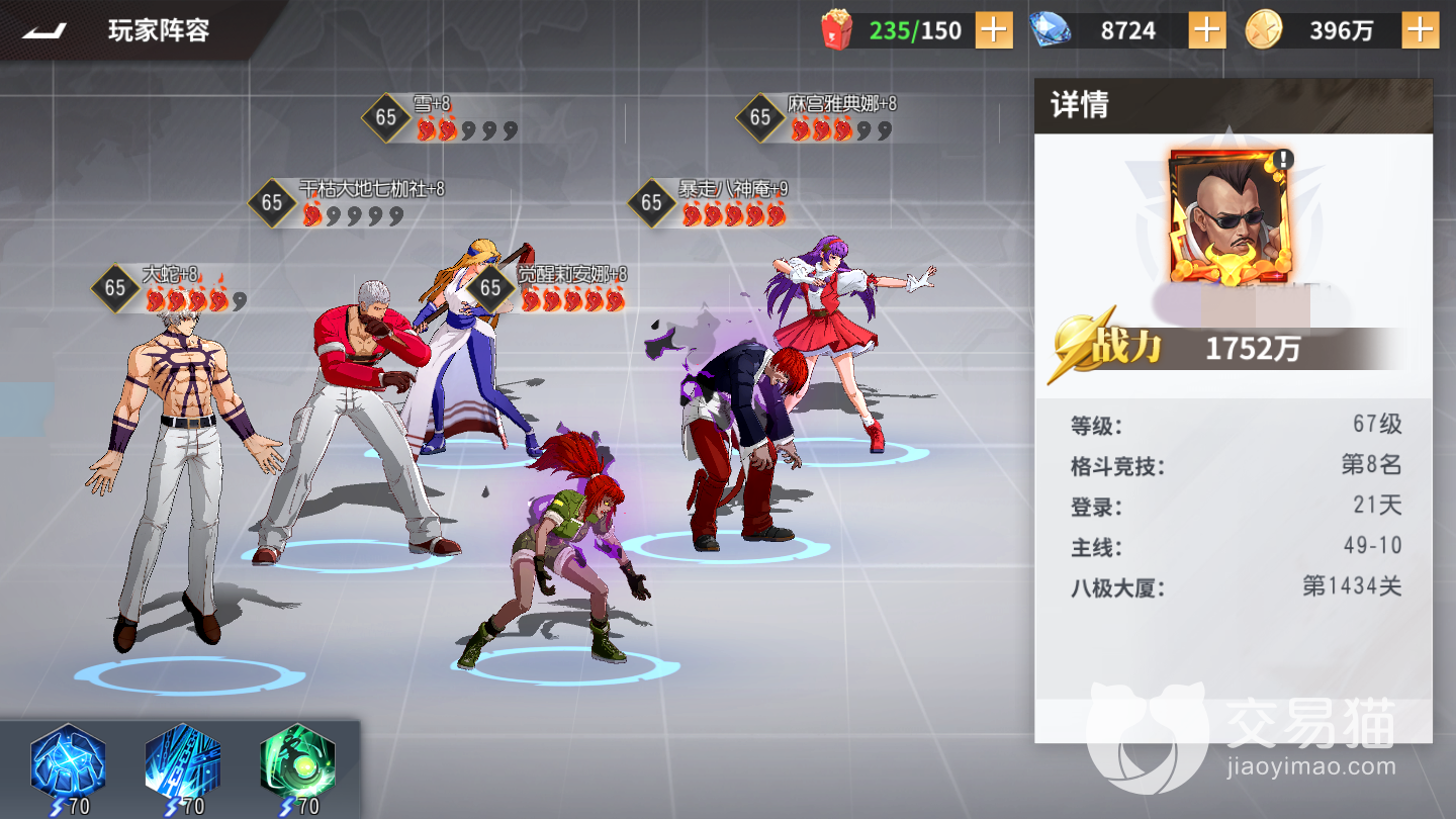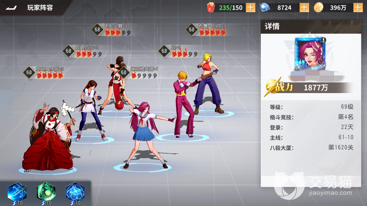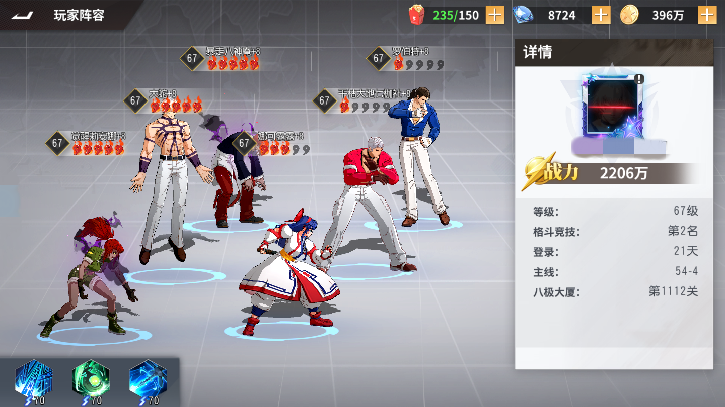 首先最强的还是大蛇右上角火舞左上角,库拉和k在下面一前一后,疯八最后面带上大地的组合了,换下了护卫的两个让大蛇作为这支队伍核心是现在最强队伍的选择,在竞技场里面基本上都是这个队伍或者抓这个队伍的组合。