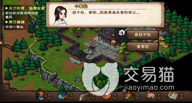 六、玩家需要跟踪李昭并且将他打一顿,然后前往姑苏寒山寺找到定远禅师进行对话询问。这个时候会有两个支线任务选项:1、【调查李昭】,2、【调查段千秋】,玩家可以任意选择一个,并不会影响后续,然后玩家在杭州摇船找到毒婆婆,然后带着小毒仙到泉州小蝴蝶岛然后回到蝶骨寒冰洞内。
