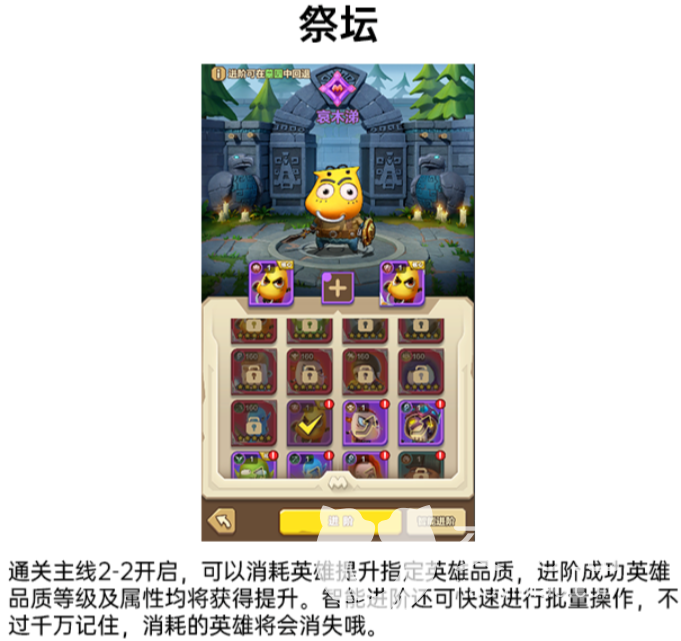 玩家可以通过祭坛来消耗一定的资源将指定英雄提升品质,进阶成功后会对英雄产生质一般的飞跃。在生命值、攻击力、防御力等方面属性都会大大的提升。