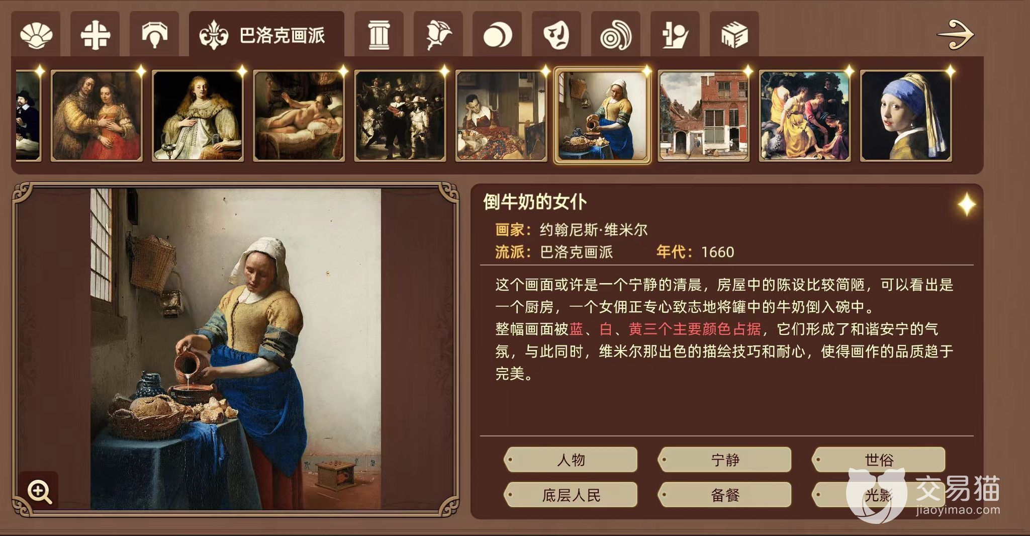 在名画展游戏中,我们购买到画作后,要根据画作的特点和介绍打上标签。巴洛克画派是我们第一个接触到的画派,那么名画展巴洛克画派标签怎么打?巴洛克画派诞生于16世纪,形成于巴洛克艺术运动中,很多玩家并不是特别熟悉,今天小编就给大家带来巴洛克画派全作品标签一览。