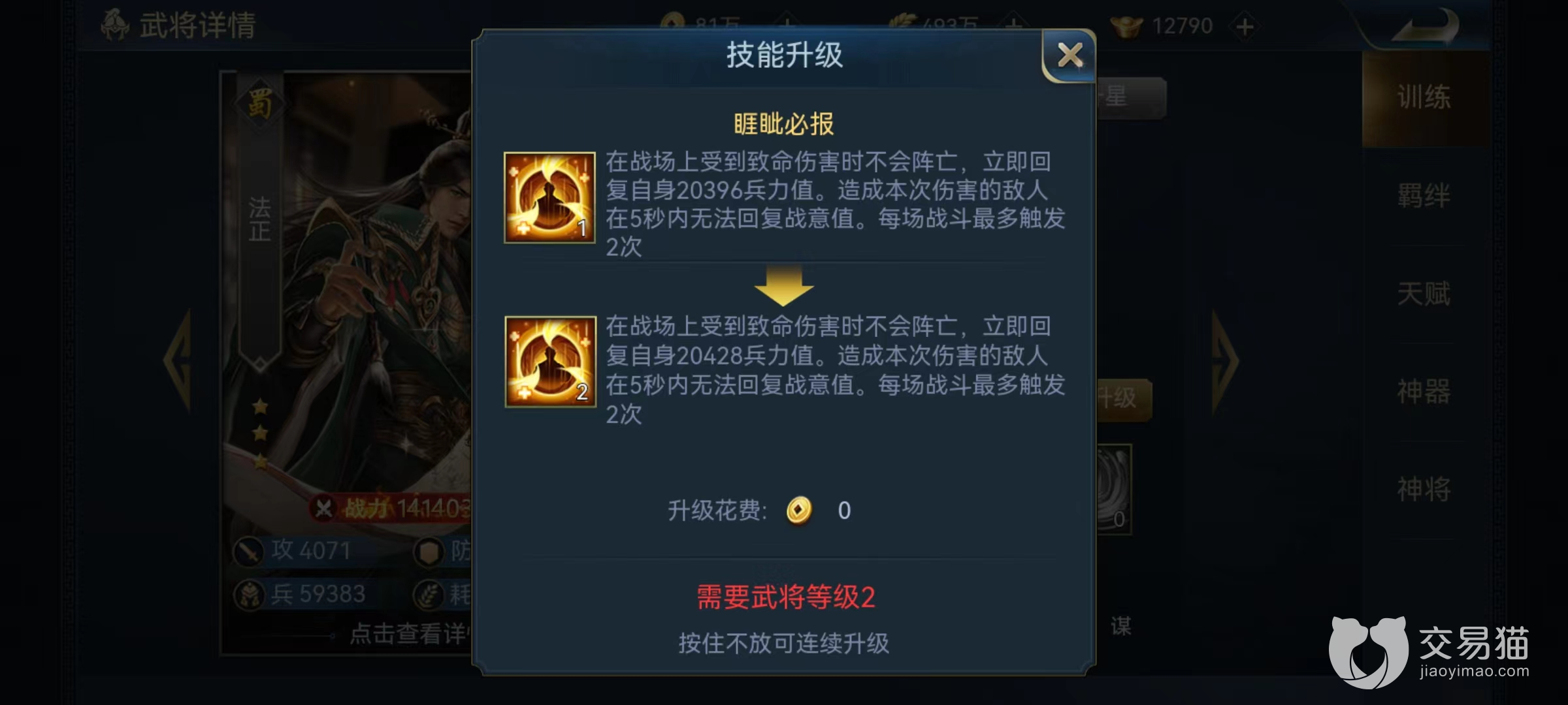 第2个技能睚眦必爆,一旦法正受到致命伤害时不会立即阵亡,而是获得一次兵力回复,对法正造成致死伤害的敌人在接下来的5秒钟之内无法恢复战意。这一效果每场战斗可以触发两次,也就是说法正拥有三条命,几乎很难被击杀掉。在谋士型武将中,反正可以保证战到最后。