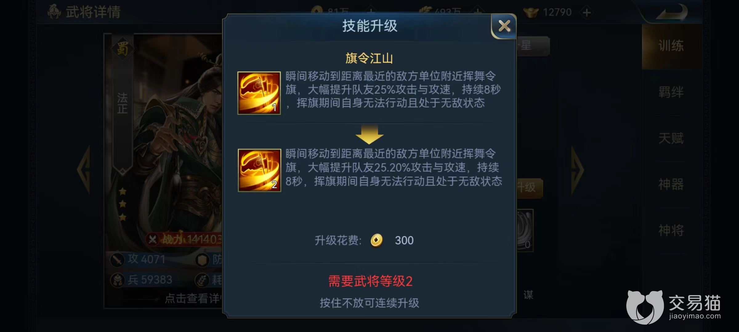 首先在资质上法正同样是sss级的角色,成长极其可观,初始谋略能够达到160点,在谋士中属于比较高的一个。一技能旗令江山,可以进行瞬间移动到距离最近的敌方单位身旁,挥舞令旗提高队友的攻击速度和攻击力,能够持续8秒钟。在技能持续期间内法正虽然无法移动,但是处于无敌状态。这在整个游戏中都属于非常强大的状态提升的技能,将团队整体输出提高到一个极高的层次。