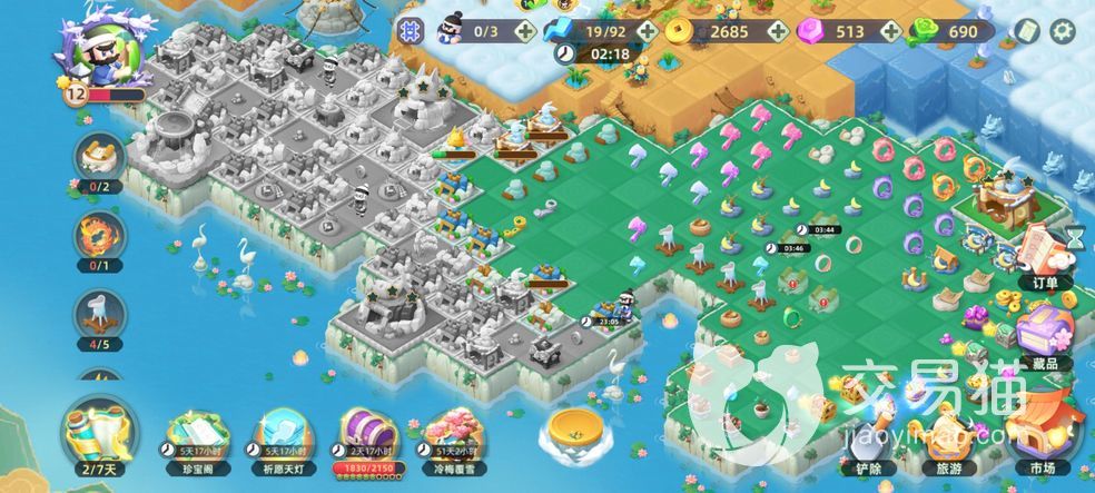 之后就是建造建筑了,地图的迷雾被驱散后,玩家可以在上面按照自己喜好的布局来建造建筑,建筑最高可升到宫殿,但每个种类的建筑只能同时拥有一座宫殿,然后宫殿也可以最高升到满级,增加整个小岛的装饰度。