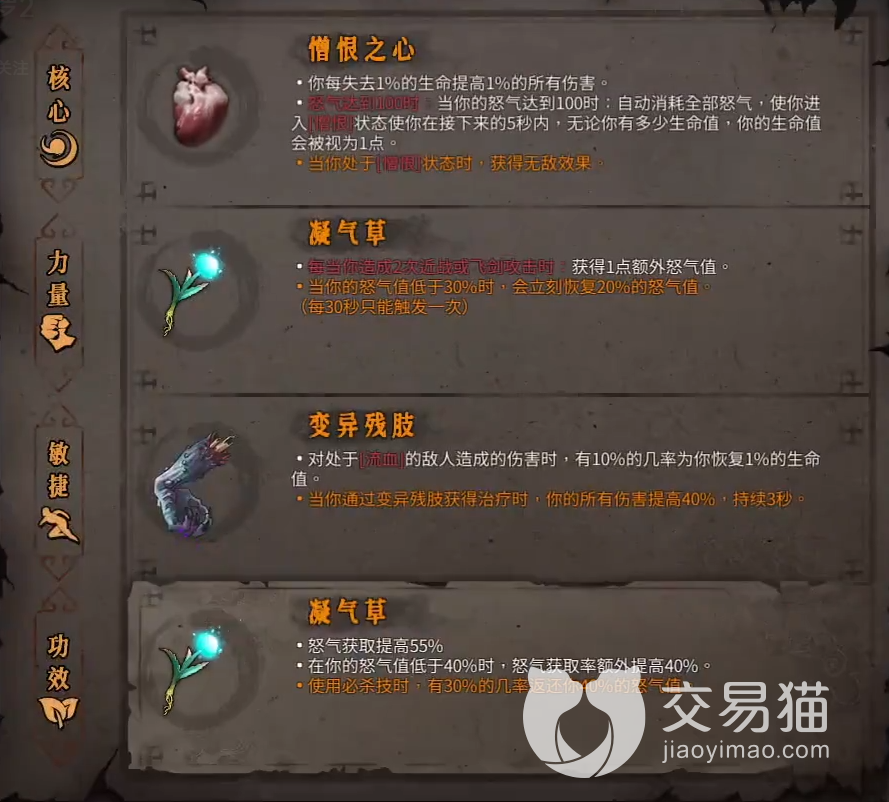 最后无论什么职业最后走向的都是伤害,所以憎恨之心也就是玩家口中的猪心直接选择作为核心再使劲找凝气草作为功效部位,搭配其他增加伤害型的圣物就是很多后期职业的主流圣物搭配了,后期的怪物都是血量巨高而且种类很杂一直消耗是让玩家烦躁的而且还很容易被秒杀所以玩家就需要各种的伤害搭配变成这种单一的伤害up的组合其实也是必然的选择,上面提到的续航圣物在高难度之下一定要舍弃,转而投向伤害的怀抱,回复主要依靠技能buff才能让伤害不刮痧。