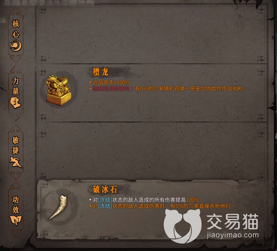 然后就是飞剑的搭配,主要的万剑和贯日的玩法,圣物选择核心机关外壳,重置收剑cd的效果是非常的强力,然后玩家选择就很少了堕龙是属于百搭的配件,然后灵玉和踏风草青龙等都是玩万剑或者贯日的常见装备,飞剑和普攻的加成是另一套系统所以很多的近战加成的圣物可以在开局之前ban掉这样就不会被圣物卡脖子了。飞剑的玩法主要依赖的不是圣物而是各种技能的伤害效果,就算神级的装备穿在身上还是经常刮痧的,所以技能书一定要找好,再搭配上面的穿搭就能让你的伤害up玩起来爽快了。