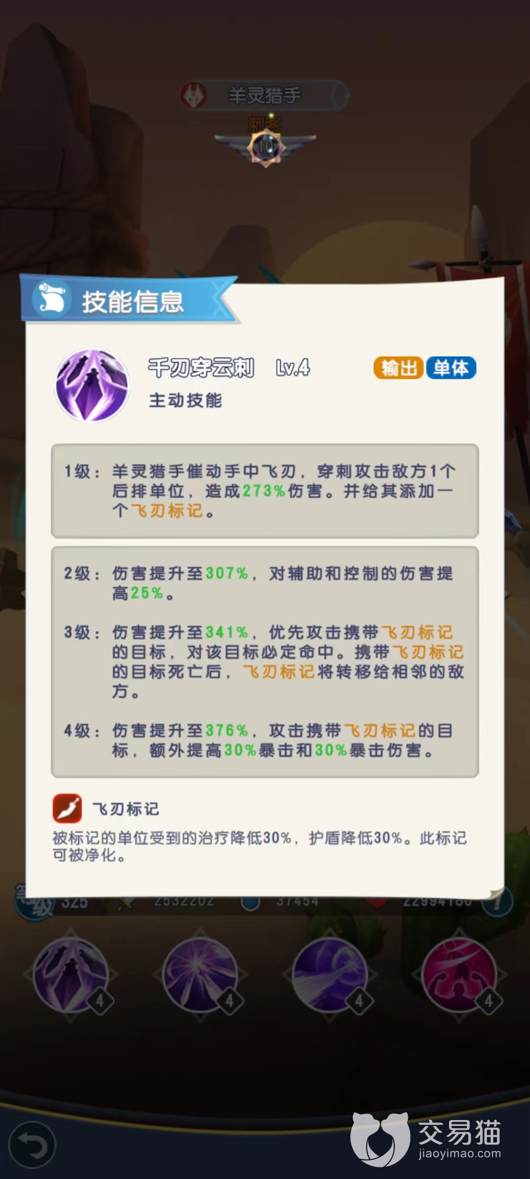 要组成一套阵容,首先要有核心输出英雄,兽族的核心是羊灵猎手,这是一个刺客型角色,擅长单体爆发。主动技能千刃穿云刺,可以选中敌方后排随机一个单位,造成极高单体伤害,并且为伤害目标添加一个飞刃标记,通过提升技能等级还将获得伤害提升和额外暴击率和暴击伤害的效果。