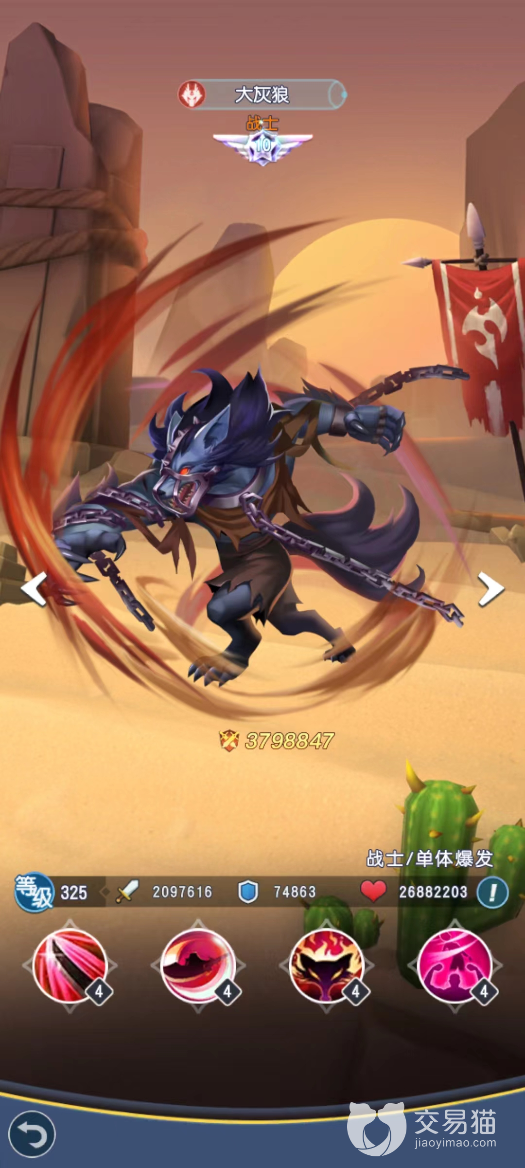 大灰狼主动技能凯撒锐爪,利用爪子伤害敌方单体目标,如果能够成功击杀则恢复自身血量。被动技能狼灵狂化,血量低于60%开始狂化,狂化之后暴击率和暴击伤害提高。最后雪原巨兽当做前排坦克,能够有几率使目标进入到冰冻状态,并且自身免疫冰冻,受到攻击时还有几率反击伤害。