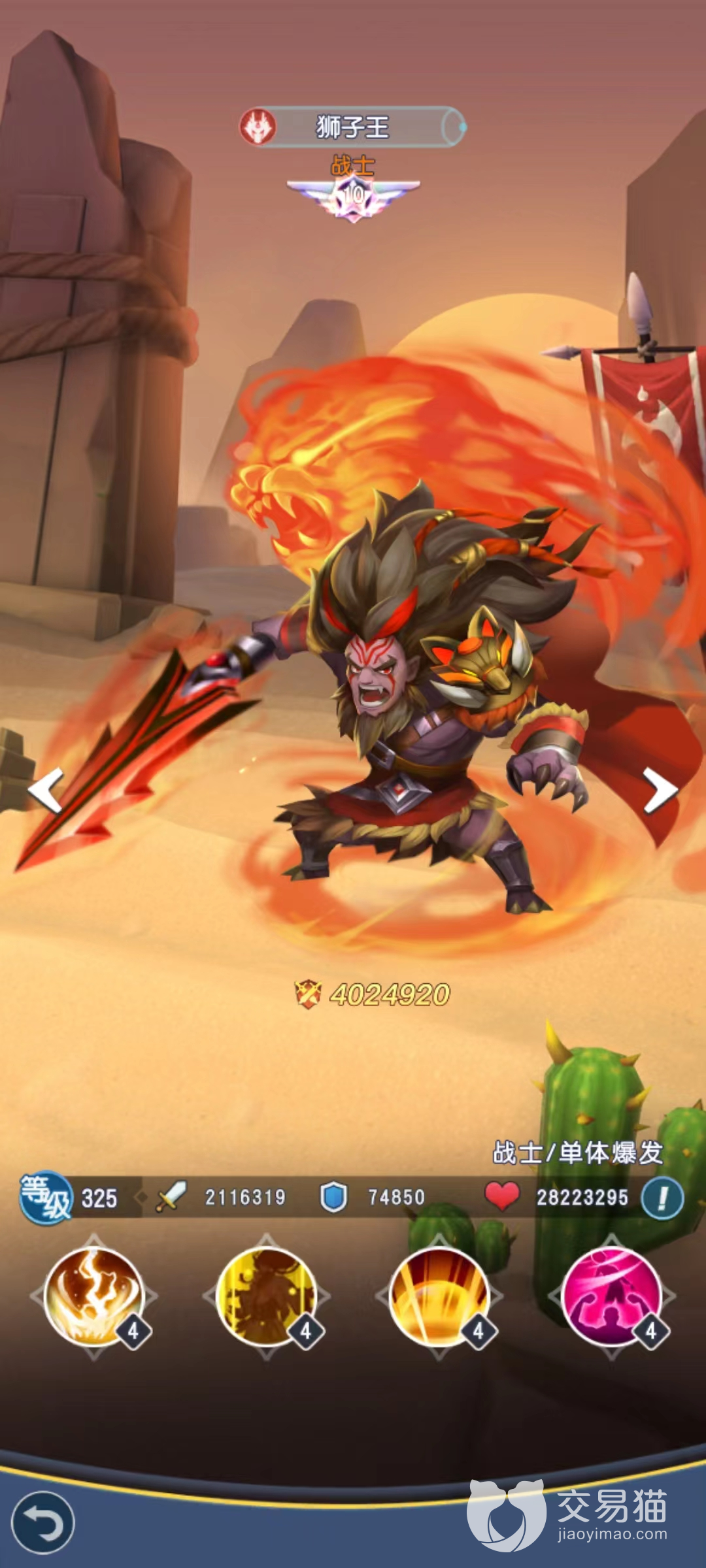 狮子王是除羊灵猎手外,兽族另一名强力输出角色,同样擅长单体爆发,主动技能狮王之怒,使用之后以牺牲血量为代价提升攻击力,持续期间内可以对敌方造成很高输出。在被能被动技能兽王狂花影响下,只要狮子王低于半血就会进入到狂化状态期间,自身所有不良效果全部清除,造成的伤害还将转化为自身血量。