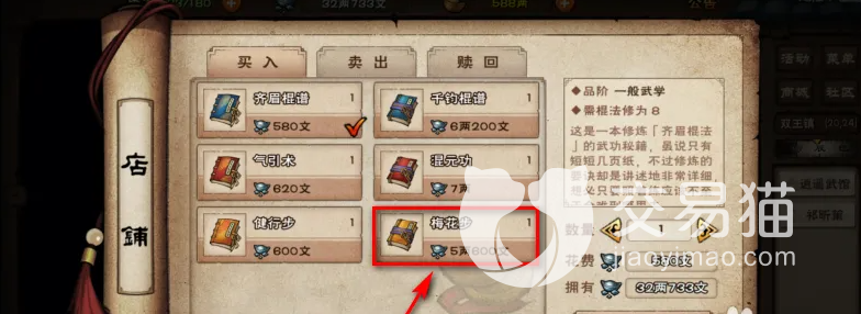 找到武馆中的NPC点击买卖进入购买的页面,在货架上翻动找到梅花步。