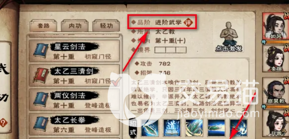 提升了以后就可以去给太乙剑武学进行进阶了,界面会有一个“武功”,点击就能看到太乙剑武学了,选择想要学习的秘籍,上面会有品阶,然后点击下方修炼就可以获得升阶了。
