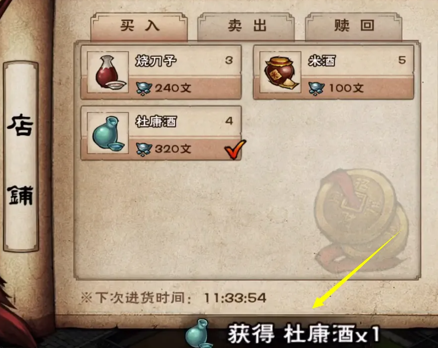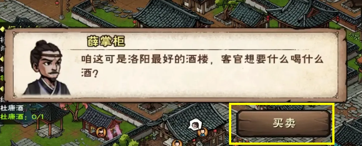 5、点击买卖栏大家就可以看到太白酒楼中所卖的物品道具,其中就有杜康酒,点击杜康酒即可购买。