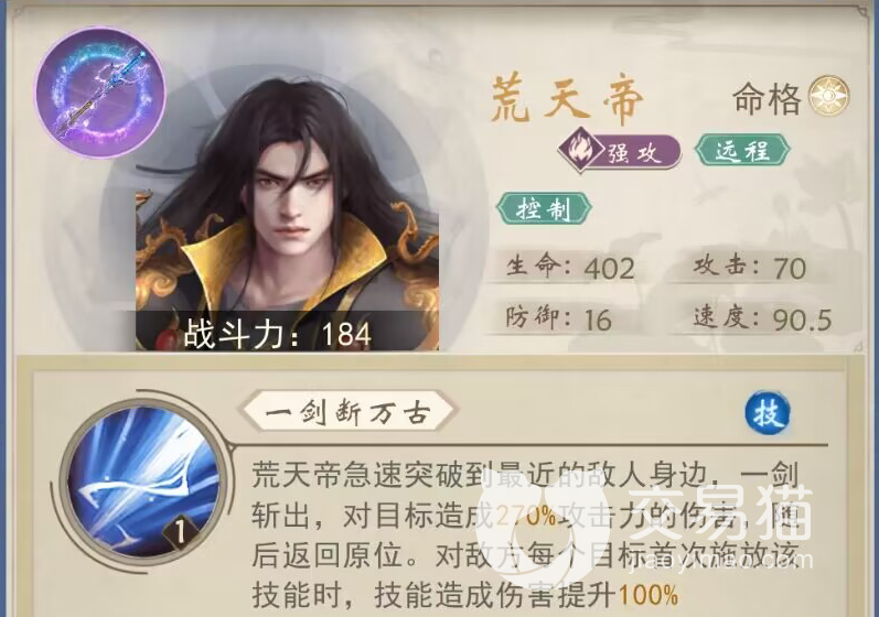 第一个肯定是我们的荒天帝,他的输出可以说是在辰东群侠传这款游戏内最高了,他的普通是对最近的敌人攻击的“剑诀”,技能是突然冲向敌人并且进行高伤害的输出后再回来的“一剑断万古”,然后绝招是可以对对面所有人员造成900%伤害的“他化自在大法”,并且有一定几率可以使对面随机两人眩晕,并且这个眩晕不可以被驱散,是辰东群侠传里当之无愧的最强输出。
