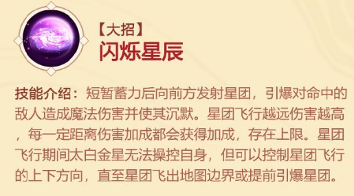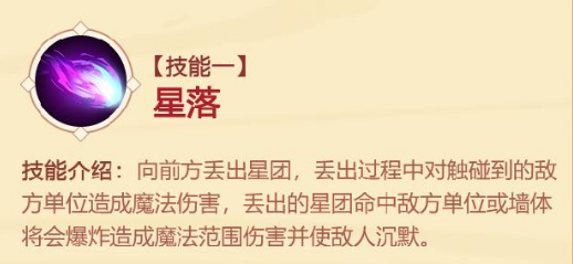 向前方丢出星团,丢出的过程中,触碰到敌人会造成魔法伤害,丢出的星团命中敌方单位或墙体时,会造成范围的魔法伤害且附加沉默的效果。