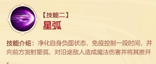 净化自身的所有负面效果,且免疫控制一段时间,并向前方发射星弧,对面前沿途的敌人造成魔法伤害且击退。