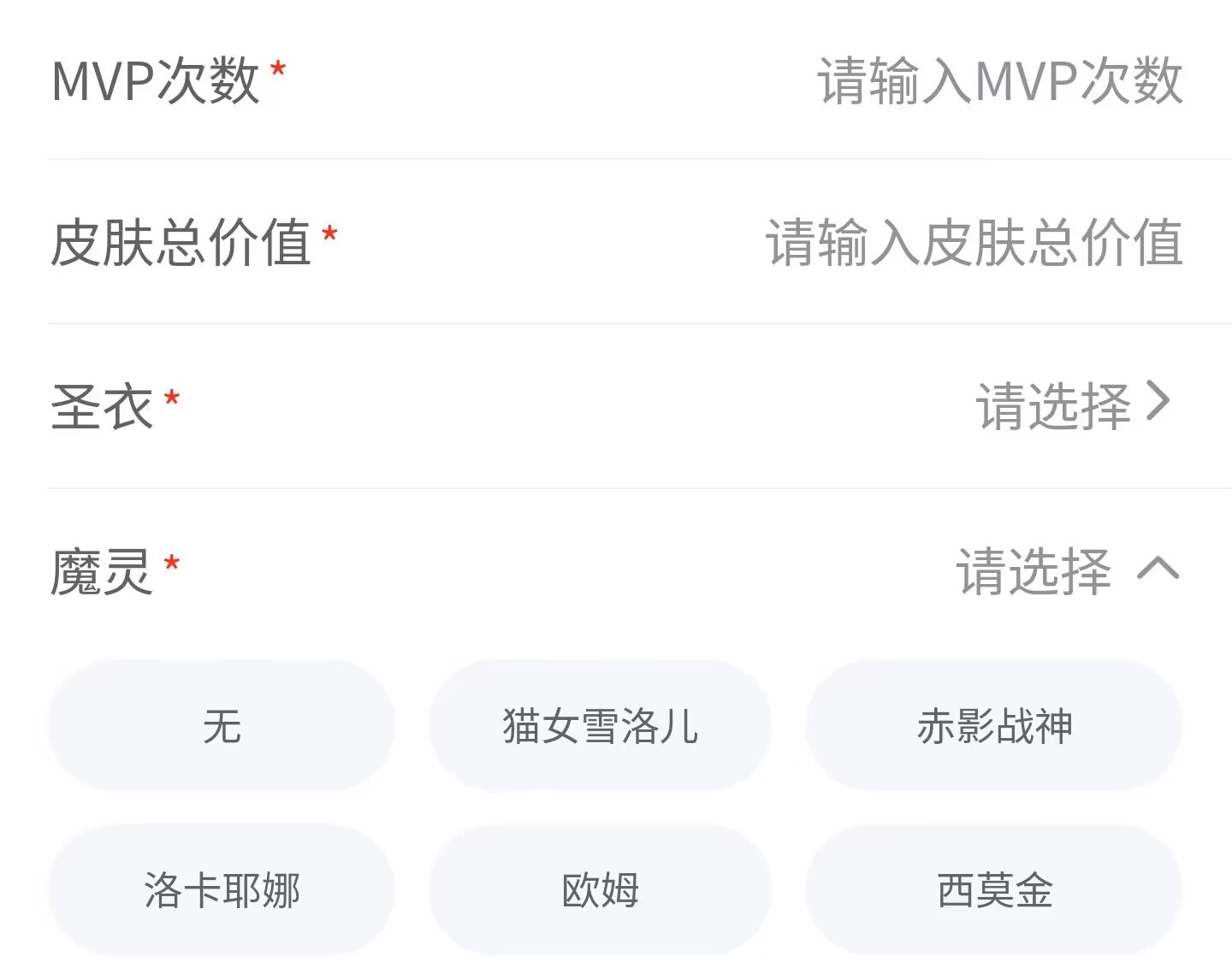 其实作为账号出售者在平台的卖号唯一比较复杂的就是一步一步的填写自己的账号信息,而该平台为大家做了很好的分类总结,直接根据系统的引导填写相关内容就可以:MVP次数、皮肤总价值、圣衣、魔灵和账号绑定情况,其中各种皮肤和圣衣魔灵都是以选择题的形式让大家点击,而不是打字输入,这简直是真的太贴心了好吗!