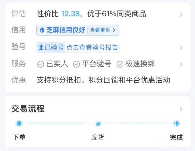 为了让每一位使用他的玩家都可以购买到最具性价比的心仪账号,在他的订单详情页之中,除了拥有账号的评估以及性价比以外,买家的信用以及实名认证等,都会做出标识,这么做的目的除了是为了让卖家更好的成交,也能让买家能够快速的购买想要的账号。