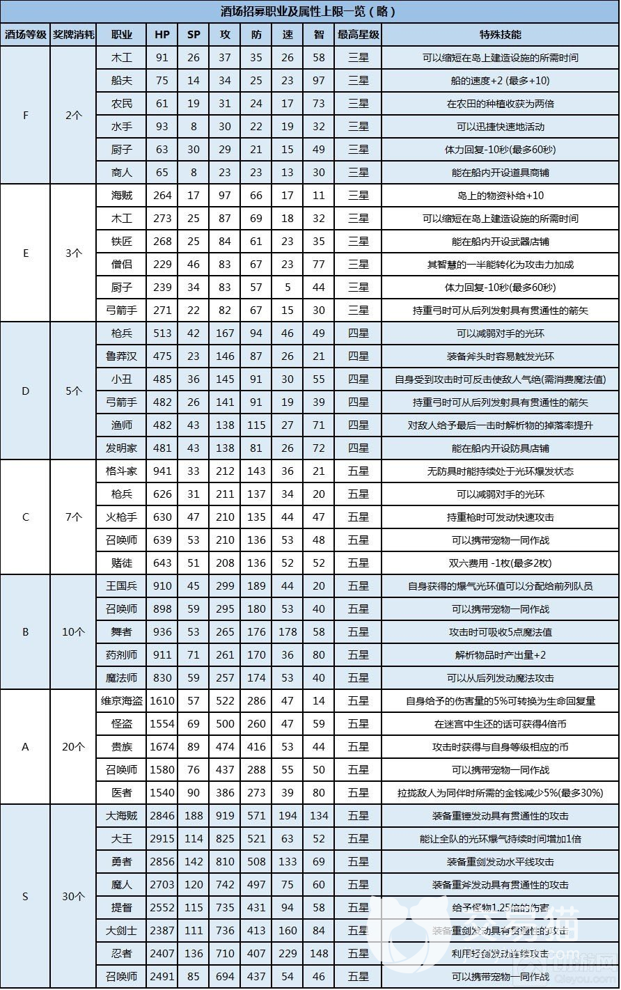 我们在酒馆进行招募是需要消耗奖牌的,在f和e评级的酒馆中,我们都只能招募三星职业,且都是功能性的队友,不具备什么战斗力。f级需要2个奖牌,e级需要3个。从d级开始,就能招募到具有战斗力的队友。d级需要5个,c级需要7个,b级需要10个,a级需要20个,s级需要30个。s级的队友拥有天花板级的属性和技能,是后期我们所必需的。这里小编把各地酒馆不同招募队友的图发给小伙伴们。