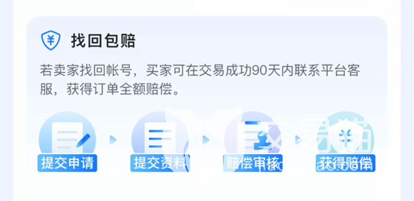 购买即送免费保险:其实就是免费给我们购买的商品投一份安全险,在交易的过程中以及购买完成之后,如果出现账号被卖家找回,或者是非个人原因导致账号被封禁从而造成无法正常使用的话,就会获得基于账号价值基础上的额外经济赔偿,所以不管是使用还是购买都是能够给大家带来很大的安全保障的。