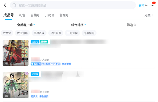 对应的商品比较多:在一念逍遥交易专区中,账号类的商品是最多的,比起游戏道具礼包以及代练等要多得多。而且这款作品有很多的渠道服版本,大家需要根据自己的情况来进行选购,在软件中也有来自各大渠道可以直接筛选。而除了成品之外,还带有一些适合新手游玩的开局账号供大家自由选择。