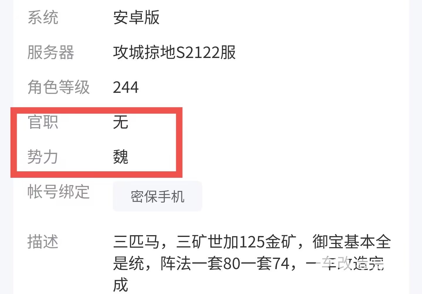对于每个游戏内的账号,购买者在进行挑选对比的时候可以直接点进去查看更详细的信息,目前该游戏支持官职、势力和密保情况这三大重要分类,剩下的就是根据图片的展示判断该账号的性价比如何,对账号价值不确定的,可以使用平台的免费估值功能来进行辨别。