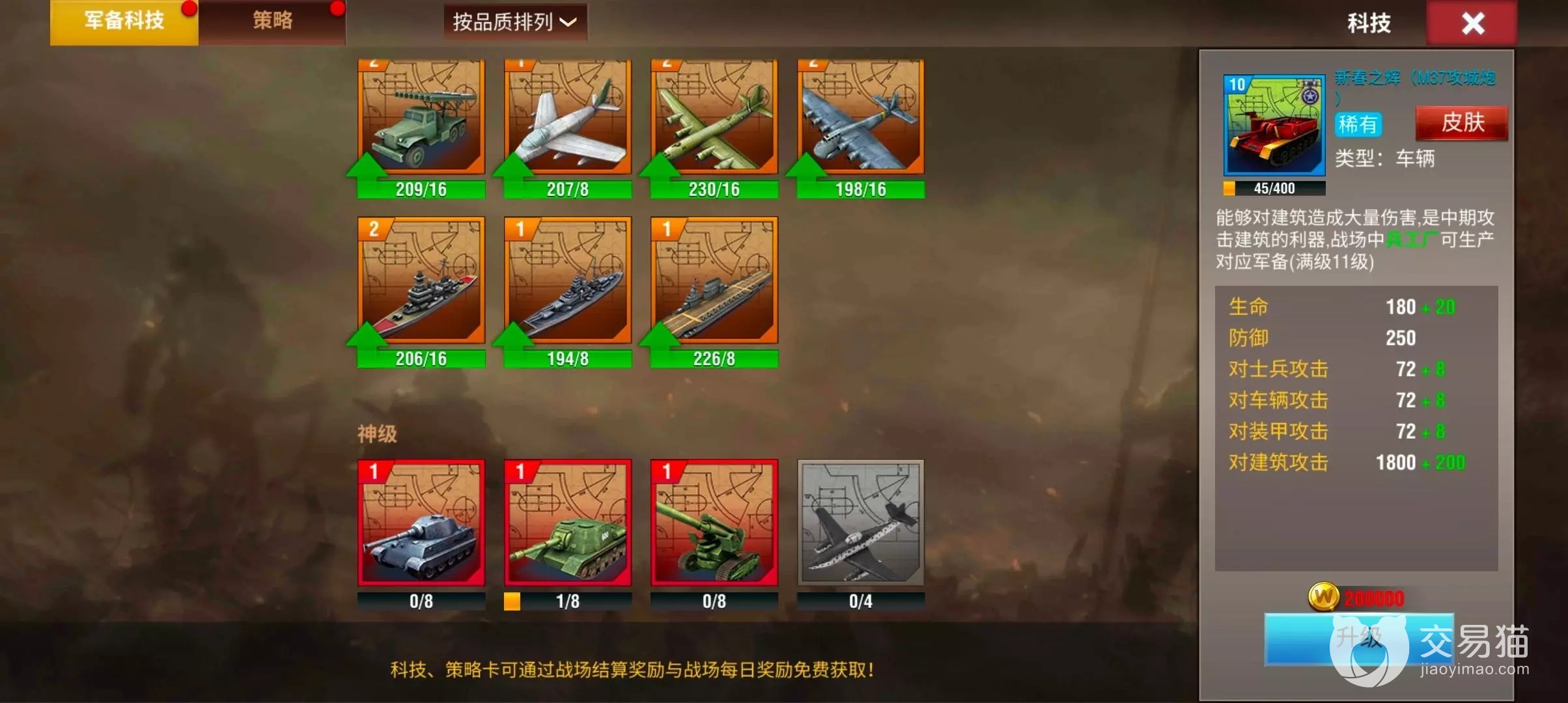 该平台内的不同账号类型却在游戏专区内有着同样的信息分类,点进去感兴趣的商品之后就可以看到商家的详细介绍,更多的是对整体阵容战斗力和所激活橙色武器的数量,什么虎象犀牛炮、攻城榴弹炮,以及游戏内的高级军官和策略点都会一一的给大家呈现,方便大家收藏之后进行对比。