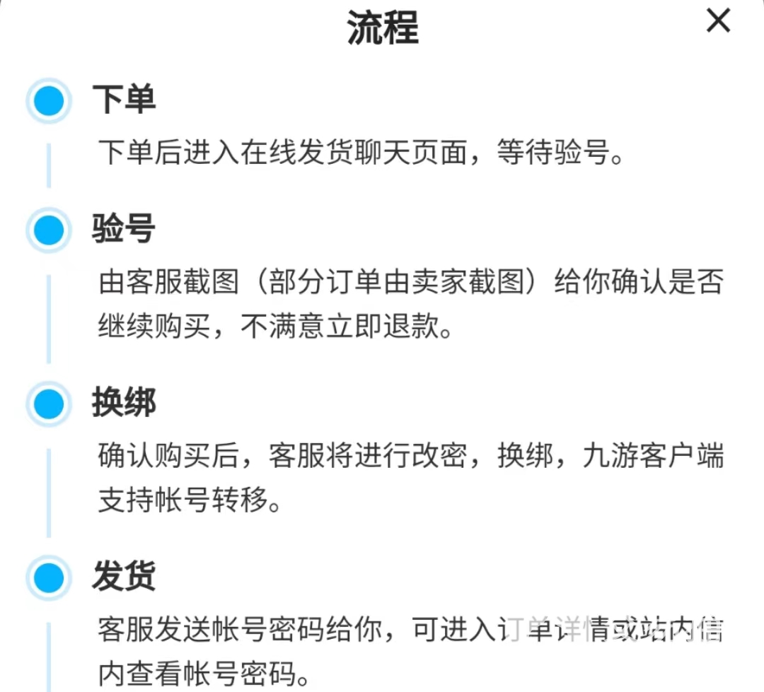 交易猫一直致力于提供优质的游戏交易服务,为了方便大家交易,平台制定了简单又高效的交易流程,从下单到验号环环相扣,并且每个流程操作都很规范。买家只要跟着流程走就可以了,即使是第一次买号也不用担心,有不明白的地方可以随时询问客服。
