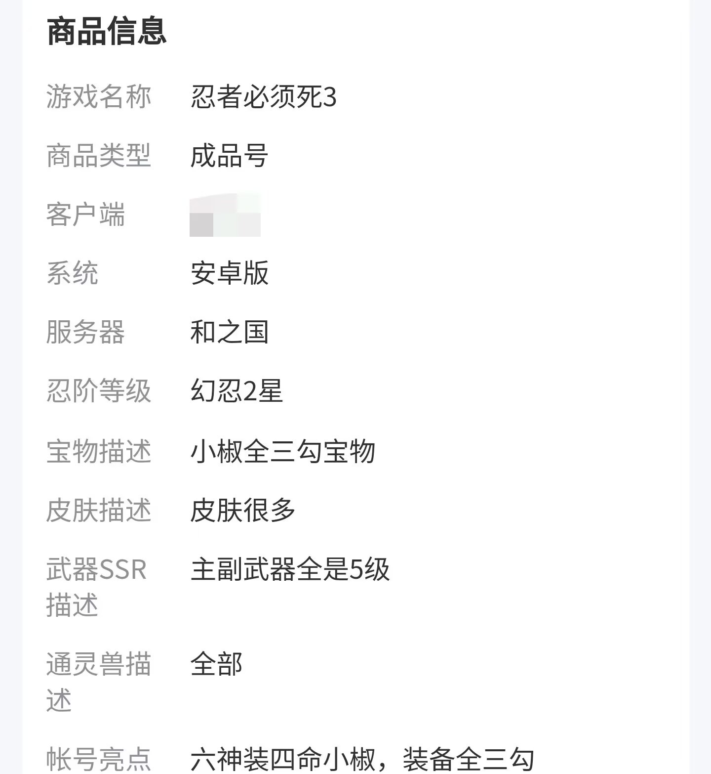 今天给大家带来的忍3买号平台哪个靠谱目前就到这里了,支持九游客户端的游戏在交易猫内完成交易其实有天然的优势,感兴趣的赶快点击上方链接下载试试吧,希望对大家有所帮助。