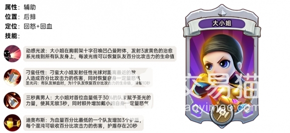 数值面板虽然比较低,大招的作用是增加群体闪避,比较有用的还是圣光术和神圣光辉,一个可以为单体的队友回血,一个可以群体回血;但治疗效果也比不上单奶的角色。如果是前期资源非常紧张,倒是可以凑个人数来作为培养,组成三人或四人的阵容,除了输出不够之外,倒是具有一定的生存能力,适合放在前排来使用。这个角色基本可以帮助新手玩家度过前期所有的难关,打通一个副本也不是问题。