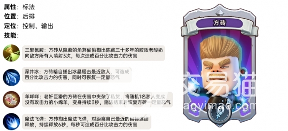 方砖的定位是控制兼输出,比较适合放后排来使用,他的技能有一定的持续伤害,同时还能造成群攻。他有个有趣的技能就是变羊术,这个技能可以把对面变成羊,达成一定的控制效果,这样一来爬塔就会变得很轻松,不过这技能生效率也不是很高,达到70层级以上的时候,就是特别看脸的时候了。