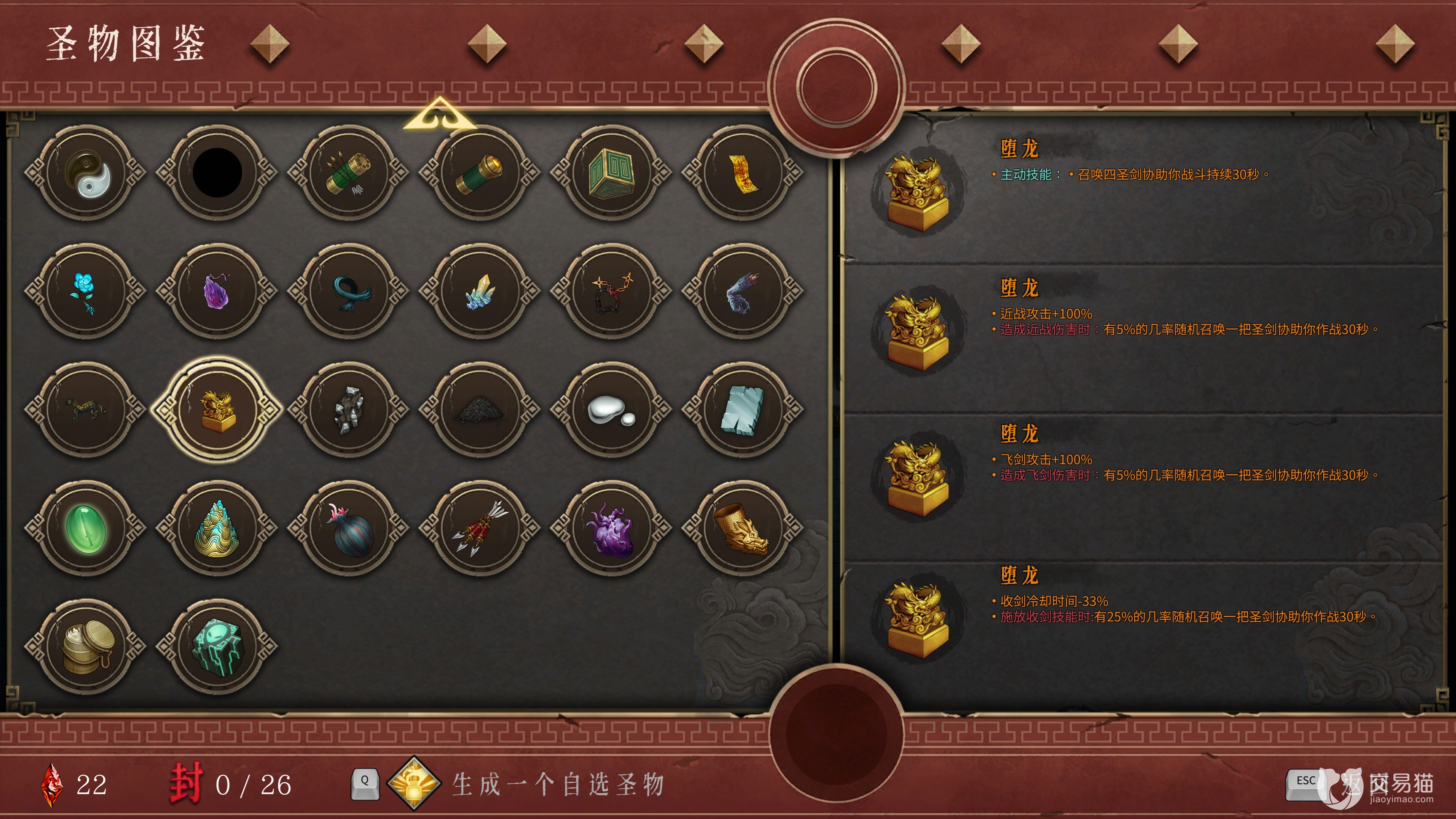 这个方法有点麻烦,如果点全了天赋玩家可以打开上面圣物图鉴选取一个金色的圣物出门,每次都可以这是最为稳妥的方式,然后玩家想要增加圣物的出产概率,也可以用红水晶ban掉一些垃圾圣物,这样每次刷新你想要的东西的概率是大幅提高了,只是品质方面没有保证。