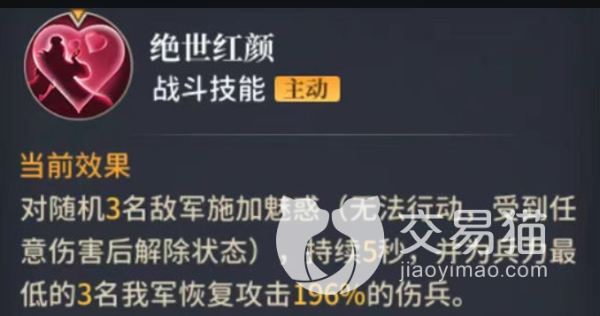 在此游中貂蝉有四个技能,其中有是三个都是被动型的,唯一的主动技能名叫“绝世红颜”,主要的功效就是对地方任意三人施加魅惑效果,在此期间是不能行动的,并且受到伤害就会接触此状态。此效果会持续五秒,还有一定的恢复功能。