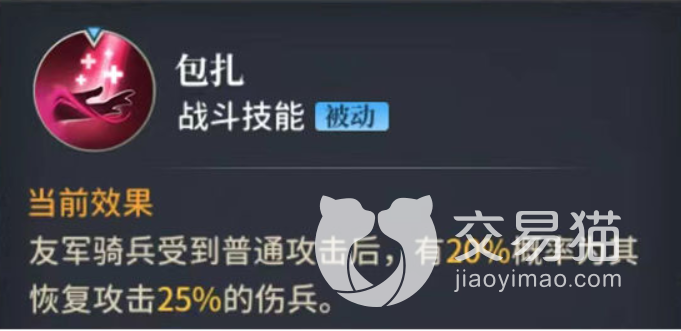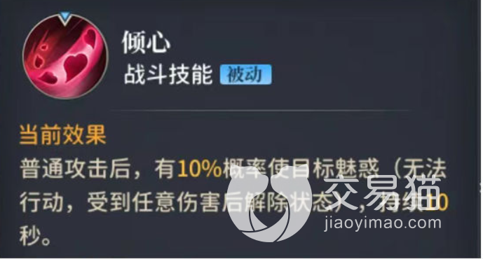 其中一个被动技能名叫“包扎”,是在自家人员受到攻击之后,就会有百分之二十的几率为其进行恢复处理。而“倾心”这个技能的功效是,在使用普攻以后,会有百分之十的几率方指定目标受到魅惑效果,此期间无法移动,会持续十秒。