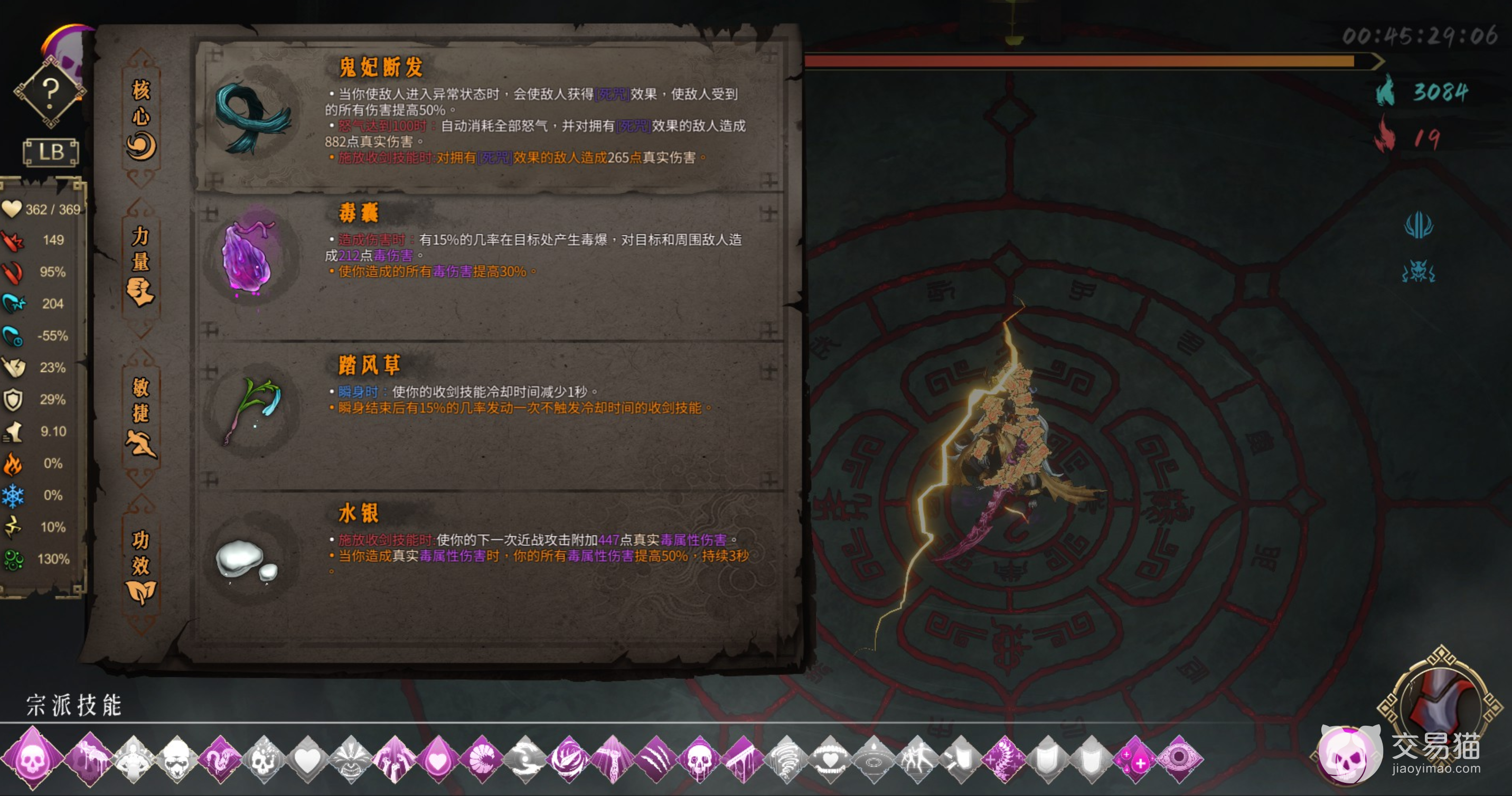 毒的第二分支虽然可以稳定放毒的附着但是七把剑对于高难度的怪来说完全是不够的,所以玩家需要再找一些手段来放毒,那么毒圣物就必不可少了,像是毒囊,断发还有水银等都是基本必带的,基本是一号位置断发二号位置毒囊了,四号位置水银,三号位置最好是踏风草可以让玩家恢复收剑技能的冷却。