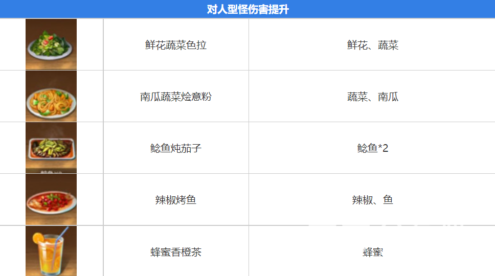完成这道菜之后,大家在对战中要是食用它的话,可以让角色对人形怪物的伤害得到额外的加成效果。除了这道菜外,还有鲶鱼炖茄子,辣椒烤鱼等菜品可以带来与它相同的效果,不过它所需的配方是不一样的,大家可以参考一下去寻找食材,完成菜品的搭配。