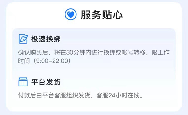 除了账号的真实性,相信一个是否可靠的交易双方也是,这个账号我确实喜欢,但是这个卖家是否说话算话按时将账号发给我,完成账号转移,是每一个玩家的顾虑,我将这个账号转移给你,买家有没有按时将钱发给卖家,也是每一个卖家的顾虑,而我给大家分享的这个平台完美的为大家解决了这个问题,在这个平台上,买卖双方都需要进行认证,公开每一个卖家的诚信度,让这个交易更加的贴心安心,不仅如此,在完成交易后,这个平台还会给每一个买卖双方提供完整的售后服务,无需等待,半小时收到账号,就可以开始进行,换绑,账号转移,24小时守候你在这个平台进行的交易,所有的问题都可以找客服一一解决。让交易变的安心。