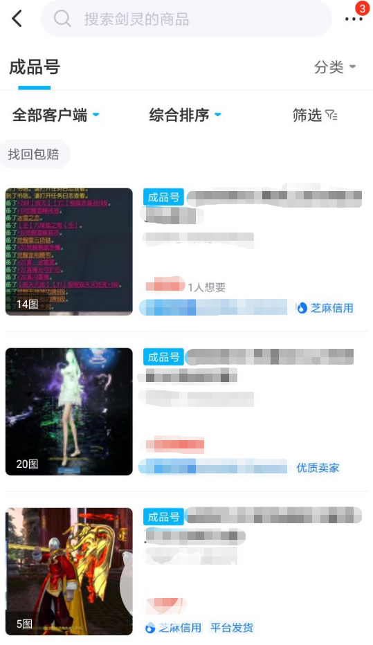 1、针对性的游戏专区当中,只会出现关于剑灵的一切商品信息,不同类型的账号也会在标题栏当中进行展示,玩家们可以迅速判断出该商品是成品号还是一些较为初级的开局号。这些基础信息,可以直接成为玩家们判断该商品是否值得继续关注的重要因素。