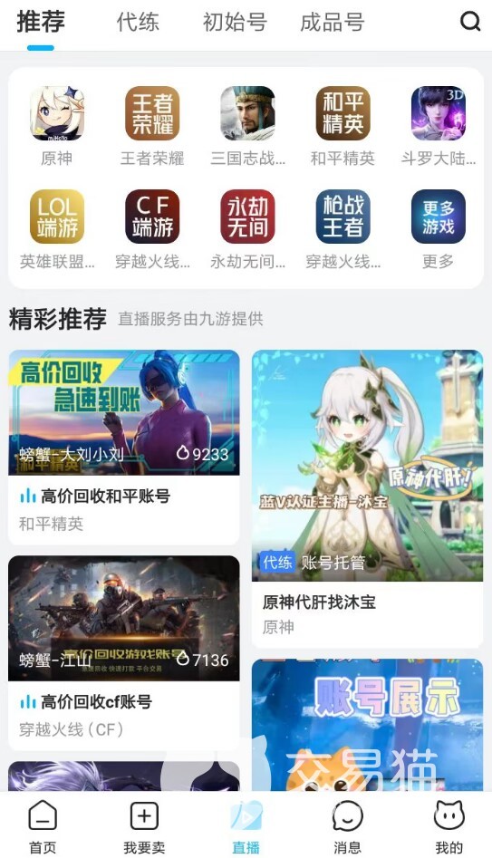 和传统的平台不一样的是,在交易猫上有着当下最新的直播间推荐购买,大家可以根据里面的主播推荐的商品,进行一些选择,通过这些主播,我们可以在里面了解一些当下游戏的信息,这比别的平台最大的优势在于,可以快速的了解商品的信息,快来和小编一起试试吧。
