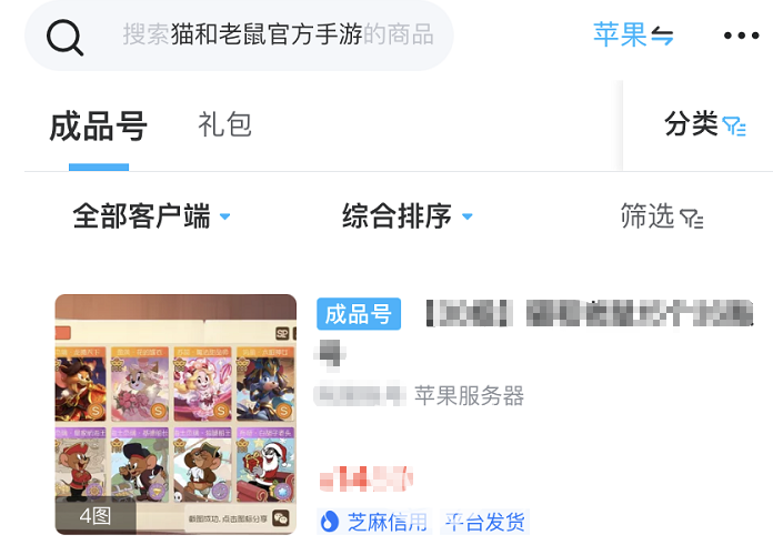 交易猫可以帮助大家快速购买到心仪的账号,而且还拥有非常全面的游戏资源,除了猫和老鼠之外,里面涵盖了上万款不同类型的海内外大型游戏,基本上所有的玩家都可以在这里实现买号需求,像猫和老鼠这种超热门游戏,我们可以在首页直接快速的找到游戏专区,进去之后直接筛选,拥有不同的游戏类型,成品号,开局号,初始号、道具号等等,根据自己所要想购买的账号资源进行筛选就可以了。
