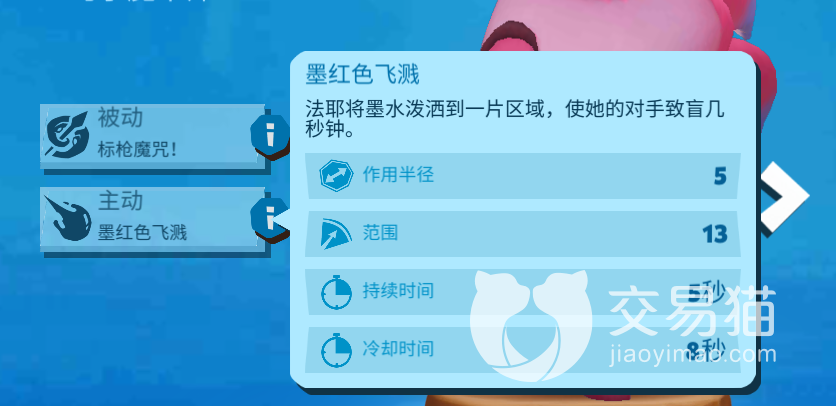 主动泼墨汁,这是一个范围技能,被墨汁波及到的敌人将被致盲,此时他们将失去外界视野,并且无法攻击到正确目标,因此该技能拥有很强的战略意义。