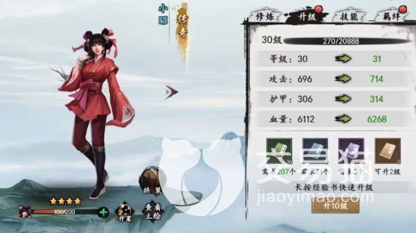第三位是小昭,小昭是个治疗能力非常强大的侠客,能复活队友、单独恢复、群体恢复、增加队友防御,非常的全能,不管什么样的队伍,基本都会带上一个的。