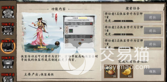游戏中的传功功能是在80级的时候才会解锁的功能,这个功能主要是给侠客加增加强大属性的,在我们解锁了之后,就可以进行传功了,而传功对角色也是有要求的,需要神话阶级以上而且达到化境的侠客才可以,放入的角色不会消失的,这个大家不要担心。不过,神话的侠客相对来说也是比较难获取的,在这里大家就要好好的去考虑自己的阵容搭配,选择最适合的阵容了。